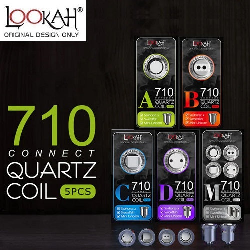 The Lookah 710 Replacement Quartz Coils come in four different styles. ?Type A is a quartz dish coil and this one is designed with flavor as the king. ?Type B is the dual hole quartz coil and this one was designed to give you the best vapor production. ?Type C is a square quartz coil that is designed to conserve your concentrates. ?Type D is a second dual hole quartz coil in a different style. These coils come individually or in a 5-Pack. ?They are compatible with the Seahorse X, the Swordfish, the?Q7 Mini, the?Dragon Egg,?and the Unicorn Mini. ?